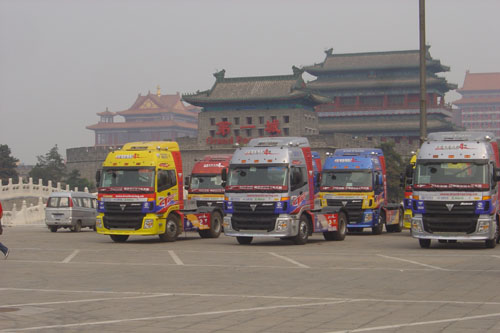 在赛手报名的同时,比赛用车已经摆在了天下第一城场地上。在一片金光映照之下的天下第一城入口广场上矗立着2006年全国卡车大赛赛事所用的威武雄狮。万点金光之下的天下第一城是如此的威武雄壮,而卡赛的雄狮们也不逊色,它们凸显的是另一种不同的雄壮,巍峨雄殿主静而肃穆,威武雄狮主动而激烈。也许我们现在还感受不到它们这种浓烈的氛围,但是它们现在正在蓄势,就像久蓄的洪峰猛然宣泄之时的猛烈一样,我们可以想见9月10日卡赛决赛这种气势的宣泄和威武的碰撞是何等的震撼!一阵激烈的火花,一片浓浓的欢乐,一笔重重的精彩,因为卡赛——2006年全国卡赛的典范巅峰对决。