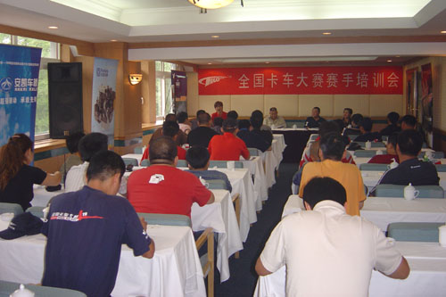 截止下午四点,赛手们报到结束,在领取到比赛用品后,赛手还舍不得离开报道现场,大家聚在报到现场相互讨论比赛心得,并向卡赛组织人员热切地咨询决赛的相关事宜。随后,在河北天下第一城新月饭店二楼会议室进行了2006年全国卡车大赛决赛赛手培训工作。本次培训邀请了6名知名裁判对近40名赛手进行了培训工作。整个培训过程热烈异常,因为要面对决赛严峻的新情况、新挑战,赛手们都积极发言提问,对此我们的培训员都给与了细致而认真的答复。