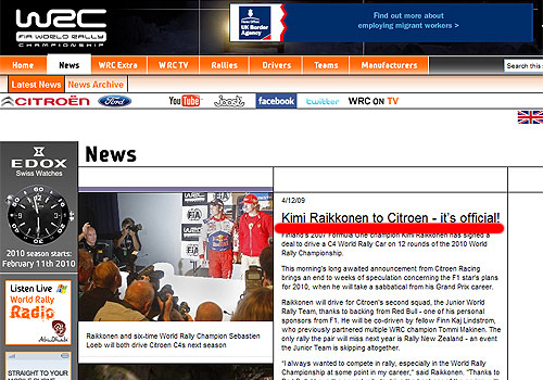 北京时间12月4日,前F1法拉利车队车手、2007年F1车手总冠军莱科宁正式确认将在2010赛季加盟WRC雪铁龙青年队征战世界汽车拉力锦标赛(WRC)。