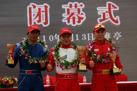 全国汽车短道拉力大奖赛苏州站前三车手合影:左起季军李辉民、冠军杜文彬、亚军贾金义。