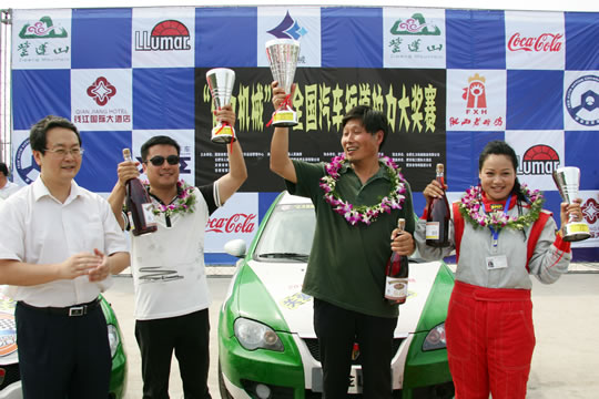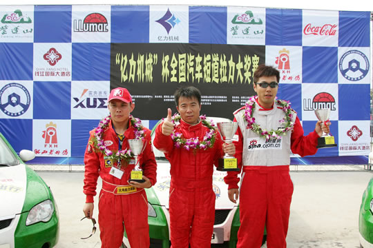 本次比赛前三名车手:左起亚军贾金义、冠军鹿炳龙、季军董亮。