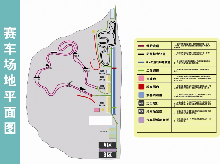 短道拉力赛道:赛道设计为双发赛道,单条赛道的长度大概1250米左右,在赛道有设置立交桥对A/B赛道进行错位换道竞技,参赛车辆必须A/B赛道完成2圈赛事;