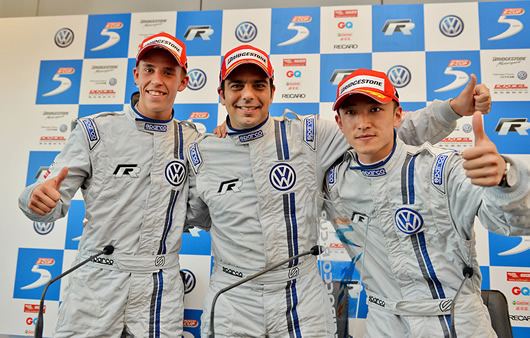 大众汽车中国赛车尚酷R杯2013赛季第四回合冠亚季军合影(由左至右:亚军丹麦车手托马斯(Thomas Fjordbach)、冠军意大利车手安德烈亚(Andrea Reggiani), 季军中国车手包金龙)大众汽车中国赛车尚酷R杯2013赛季第四回合冠亚季军合影(由左至右:亚军丹麦车手托马斯(Thomas Fjordbach)、冠军意大利车手安德烈亚(Andrea Reggiani), 季军中国车手包金龙)